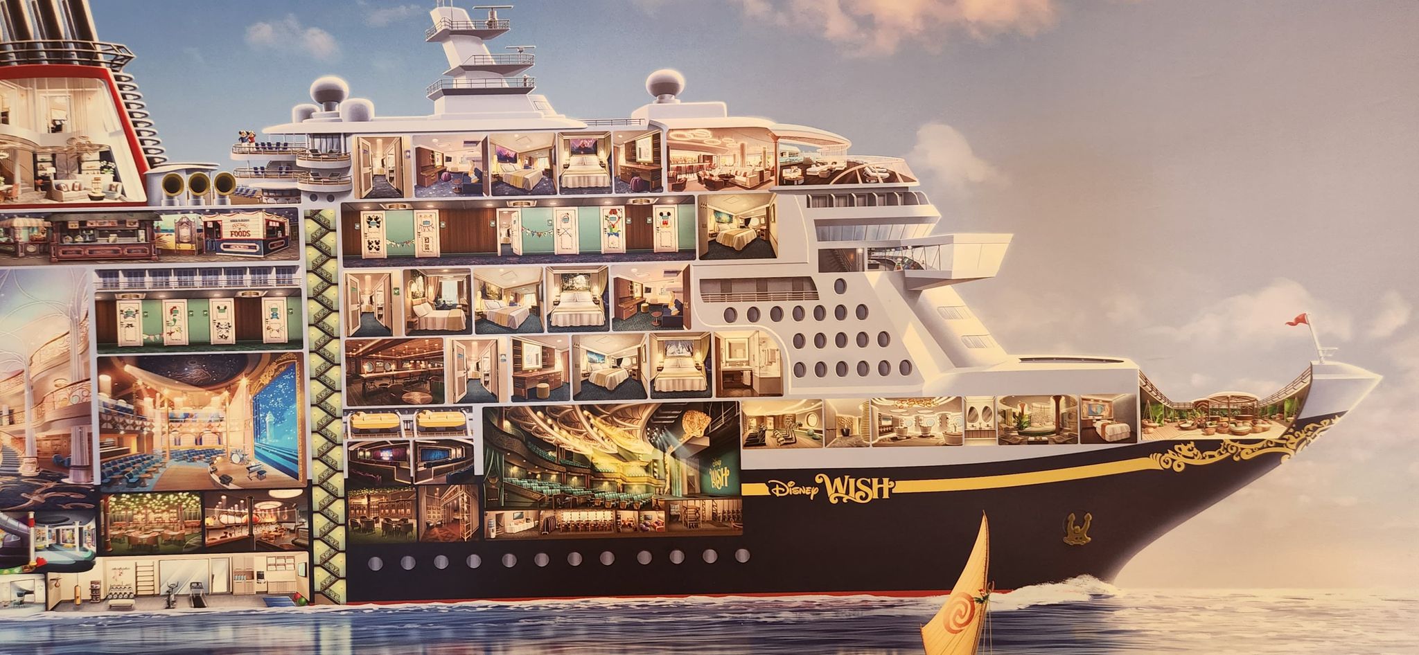 See the Disney Wish from Stem to Stearn in this stunning mural. One of the best things to see on any Disney Cruise Line ship is the artwork that is displayed around the halls and rooms. We found a Disney Wish Mural of the Wish from Stem to Stearn.