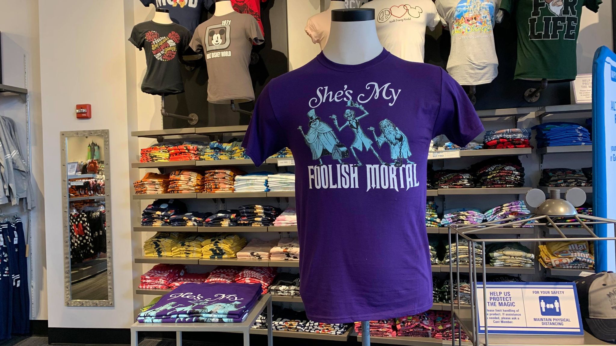 The shirts both have the Hitchhiking Ghosts we all know and love from the Haunted Mansion on them. The fun part is they are pointing their thumbs in opposite directions, so they point to the other shirt. One says “He’s My Foolish Mortal”, while the other reads “She’s My Foolish Mortal”. They are both a classic Haunted Mansion purple as well!