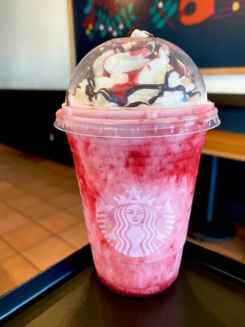- Finally, ask for mocha drizzle and strawberry puree on the bottom and top of the drink.