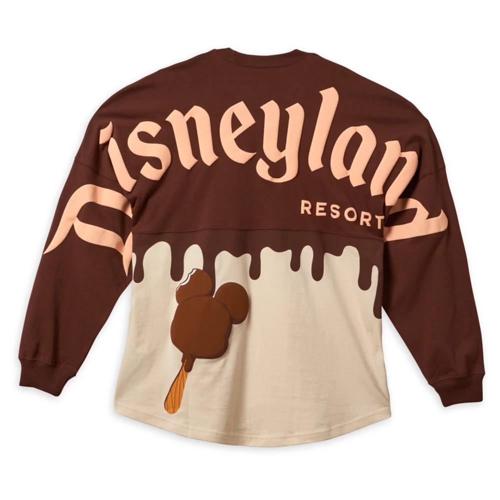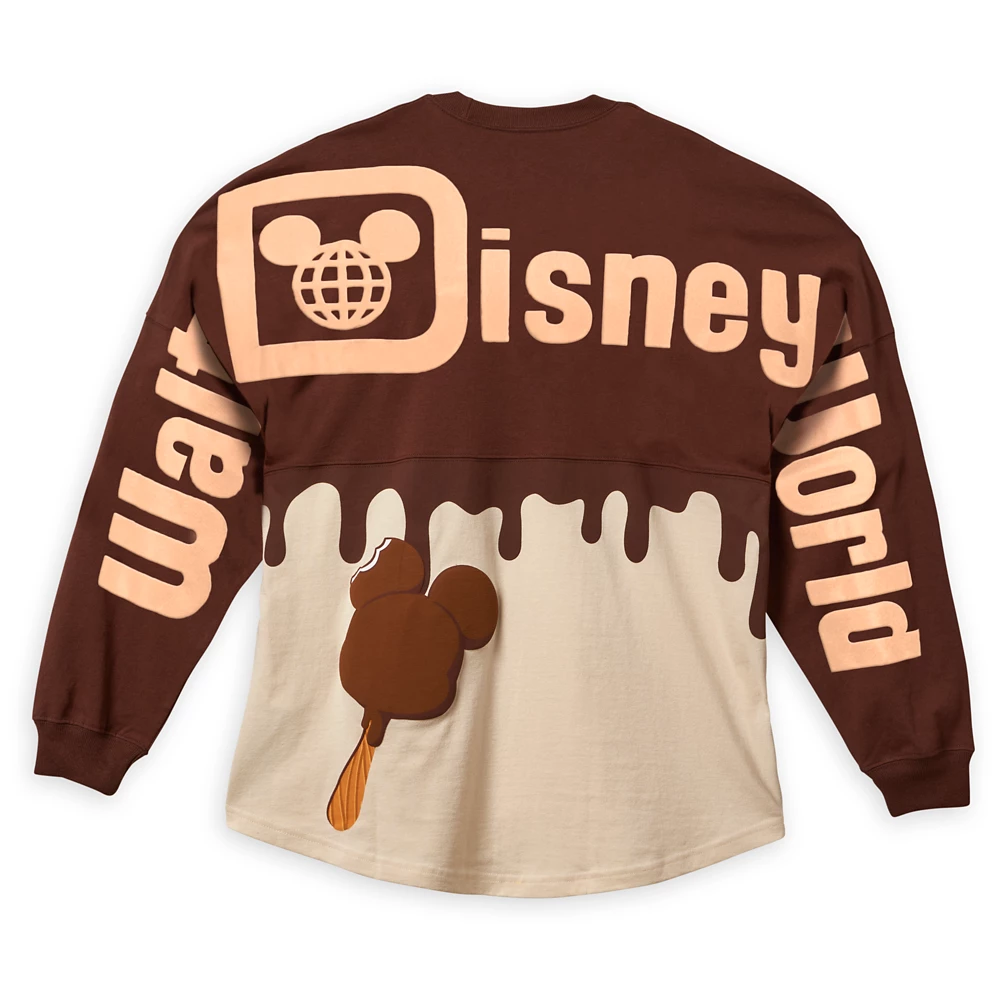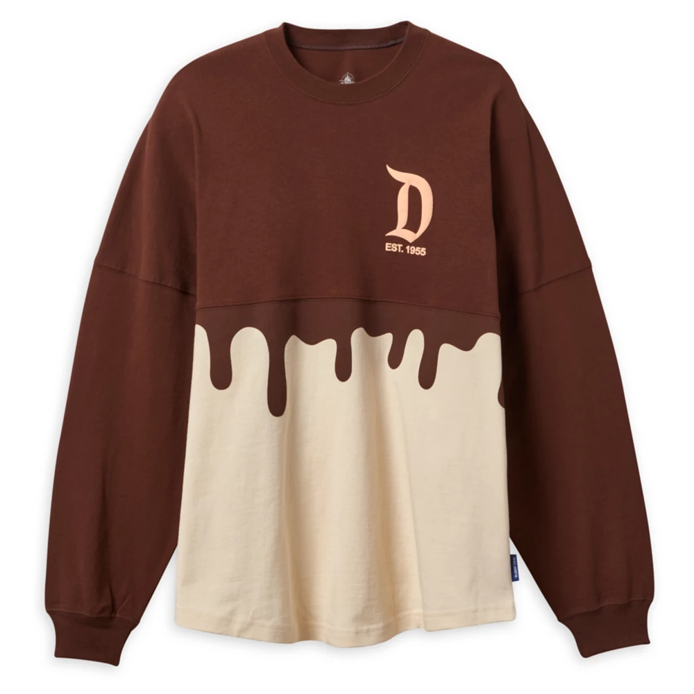 The cozy spirit jersey features a dual color of cream at the bottom simulating a vanilla ice cream with brown on top designed to look like chocolate is dripping. It also features the retro Disney logo on the front.