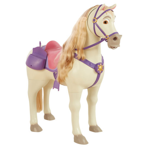 Disney’s Rapunzel: Maximus is Rapunzel’s loyal friend. Maximus stands over 2-feet tall and is the perfect companion for any child or the Playdate Rapunzel doll. Children up to 150lbs will love to sit on Maximus and play out lots of adventures with all of his features. Maximus makes neighing and trotting sounds and his head can move up and down when his reigns are pulled. He can also hold his apple in his mouth and make “chomping” noises. Maximus comes with a hair brush and hair accessories to decorate his beautiful mane and tail for ultimate hair play.