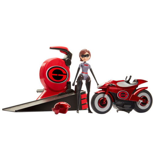 Kids can place the cycle on the launch ramp and turn the handle to power up and watch as Elastigirl stretch, then launch her into exciting action as she speeds across the floor. Wind up launch ramp to send cycle speeding on its way. The set includes Elastigirl removable figure, Elasticycle, helmet, and launch ramp with crank.