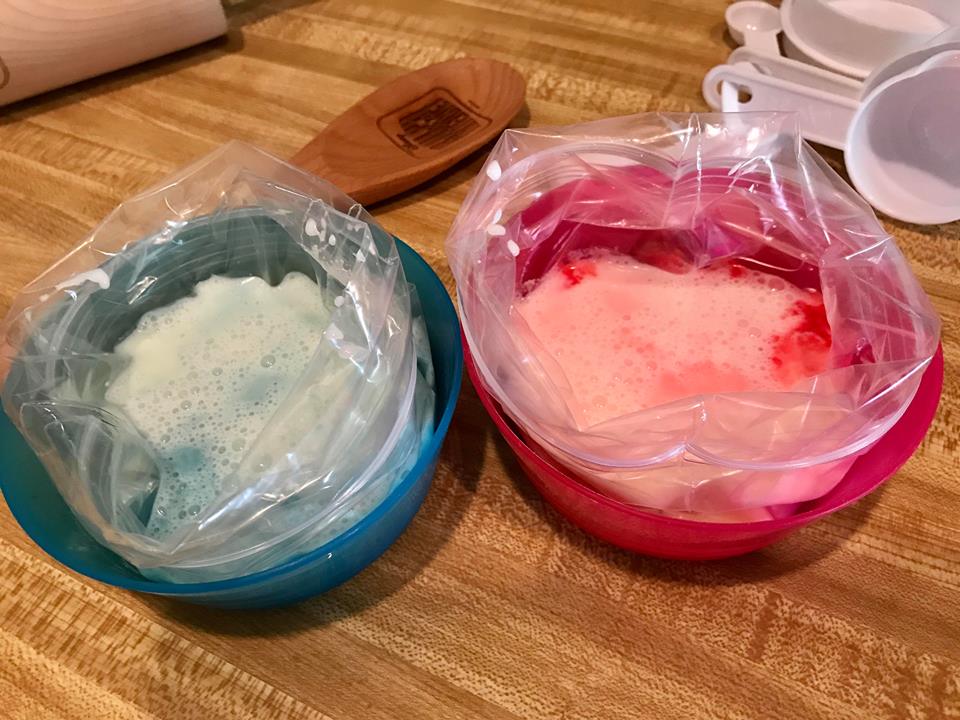 To make the ice cream base Stir the milk, sugar and vanilla together in a medium bowl. You can separate the mixture into 2 different medium bags, and add your chosen colors. Zip them up tight! Now place ice, and salt to the larger bag, and place the medium bag inside. Now comes the fun part…