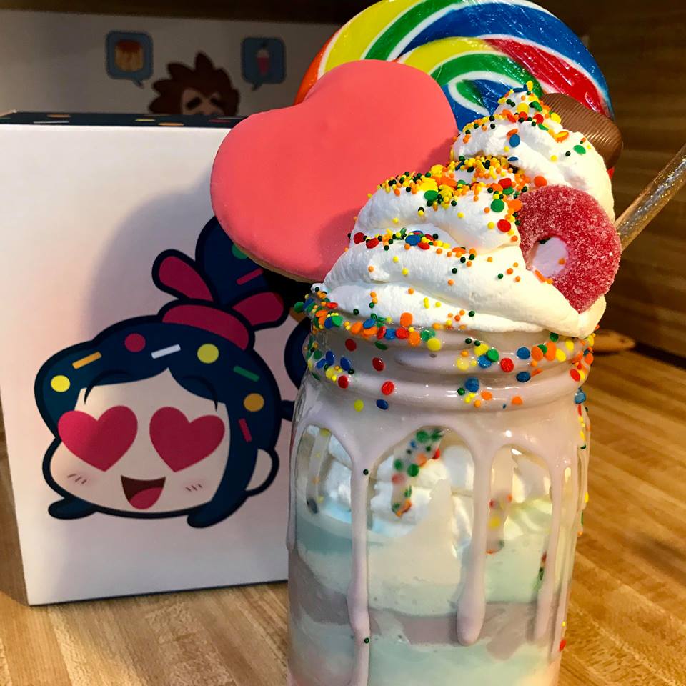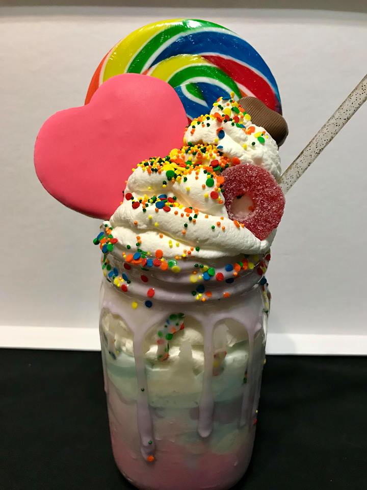 After the icing on our glasses were set, we began to construct our milkshakes! We added our pink ice cream first, then a layer or white, followed by a layer of blue to get a fun pastel rainbow look. After that we topped with PLENTY of whipped cream and added in our decorations. We opted for a Giant lollipop, a heart shaped sugar cookie, a chocolate heart, an extra large gummy lifesaver, and sprinkles. You can really choose any fun candies or sweets for this, it’s all about having fun and being creative!
