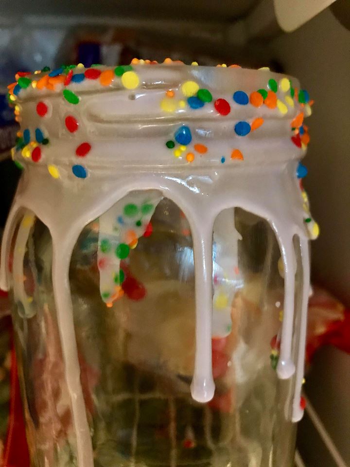 We rimmed mason jars in our icing and colorful sprinkles, and placed them in the freezer while we made the pancakes and cookies.
